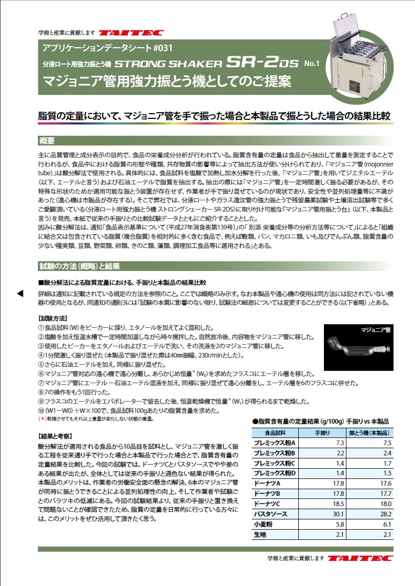 主に品質管理と成分表示の目的で、食品の栄養成分分析が行われている。脂質含有量の定量は食品から抽出して重量を測定することで行われるが、食品中における脂質の形態や種類、共存物質の影響等によって抽出方法が使い分けられており、「マジョニア管(mojonnier tube)」は酸分解法で使用される。具体的には、食品試料を塩酸で加熱し加水分解を行った後、「マジョニア管」を用いてジエチルエーテル (以下、エーテルと言う)および石油エーテルで脂質を抽出する。抽出の際には「マジョニア管」を一定時間激しく振る必要があるが、その特殊な形状のためか適用可能な振とう装置が存在せず、作業者が手で振り混ぜているのが現状であり、安全性や並列処理量等に不満が あった(遠心機は市販品が存在する)。そこで弊社では、分液ロートやガラス遠沈管の強力振とうで残留農薬試験や土壌溶出試験等で多くご愛顧頂いている〈分液ロート用強力振とう機 ストロングシェーカー SR-2DS〉に取り付け可能な『マジョニア管用振とう台』(以下、本製品と 言う)を発売、本紙で従来の手振りとの比較試験データとともにご紹介することとした。 因みに酸分解法は、通知「食品表示基準について(平成27年消食表第139号)」の「 別添 栄養成分等の分析方法等について」によると「組織 に結合又は包含されている脂質(複合脂質)を相対的に多く含む食品で、例えば穀類、パン、マカロニ類、いも及びでんぷん類、脂質含量の 少ない種実類、豆類、野菜類、卵類、きのこ類、藻類、調理加工食品等に適用される」とある。